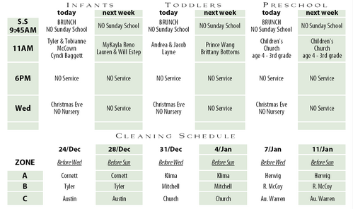 There will be no service this evening or on the evening of the 28th. Our normal Sunday evening service will resume on January 4th.